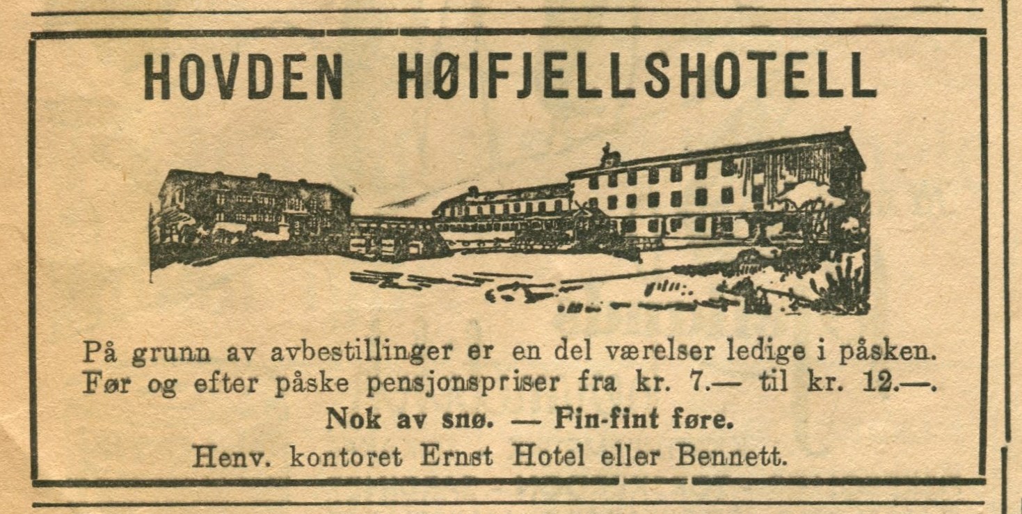 «På Hotelet er man nødt til at have alt, ogsaa flere Butiker, da man jo ikke kan `gaa til Byen, «,- skrev Vendsyssel Tidene om Norges nyeste Høifjeldshotel -Stor-Etablissementet i Hovden, tolv timers Reise fra Vendsyssel.»